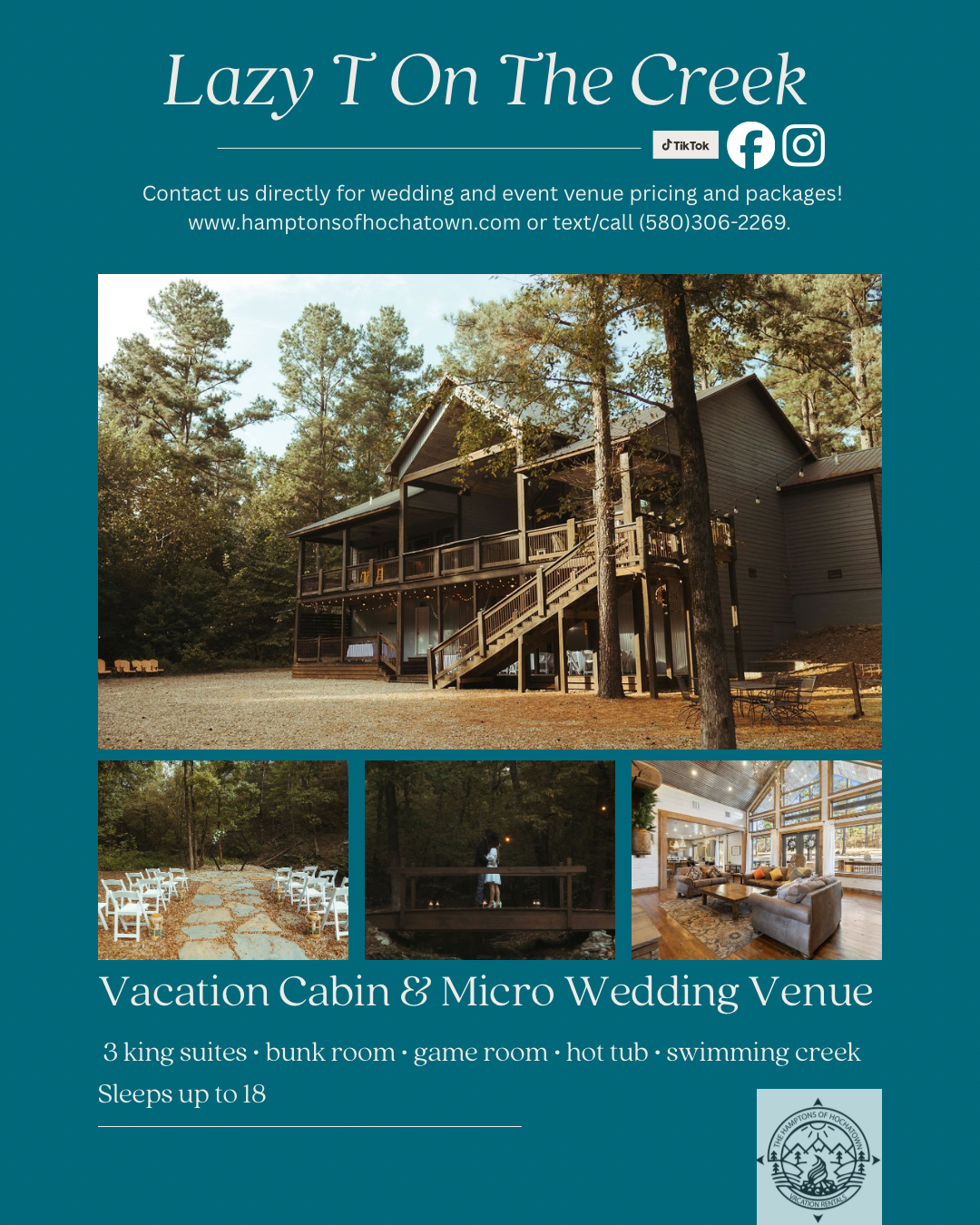 We can help you plan your destination wedding! We specialize in micro weddings and other events and can help make your special day memorable and stress free. Lazy T On The Creek is the perfect spot for your wedding guests of up to 75, and Heart of Hochatown is perfect for smaller ceremonies and events! For more information and details, text or call Charise (580)306-2269.